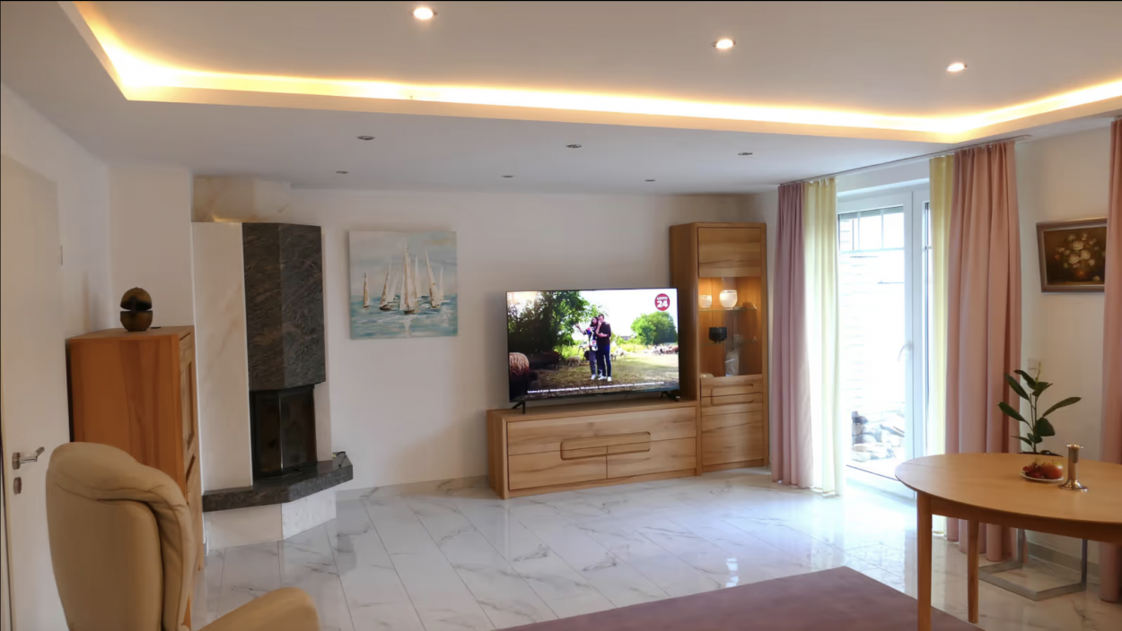 Neben 3 Schlafzimmern können Sie sich in einem über 30 qm großen Wohnzimmer mit Kamin und TV – Großbildschirm entspannen, wohlfühlen und schlafen ( 2 Personen ).